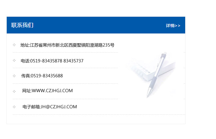 傳真:0519-83435688    郵編:213135    網址:WWW.czjhgj_com.c0302.com    電子郵箱:JH@czjhgj_com.c0302.com